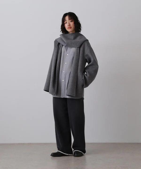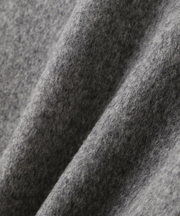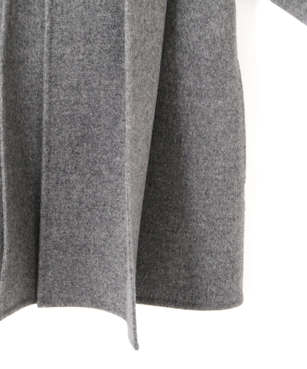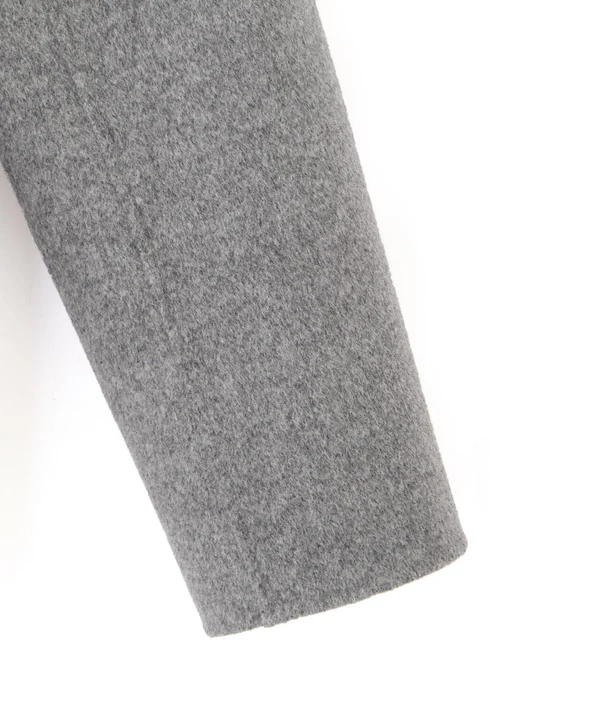 1/16 Super100s原料を使い、ダブルフェイスにて織り上げた素材になります。しなやかなながらも打ち込みを多くしてはりこしを持たせた素材です。リバー仕立てで仕上げており、ビッグシルエットなのでショートコートのようなバランスですが、太もも位の丈感になるコートです。