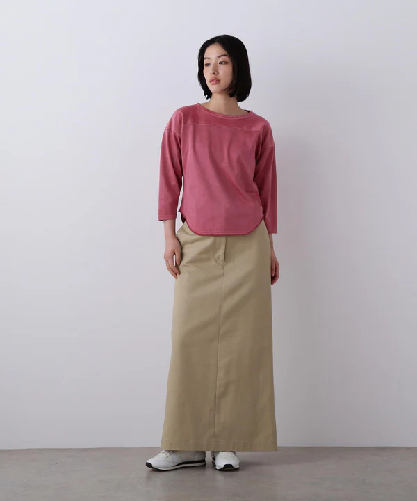 フットボール型のカットソーはコンパクトなシルエットで、女性らしく着こなせる一着に仕上げました。