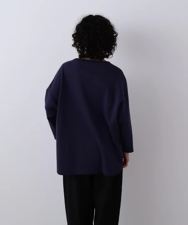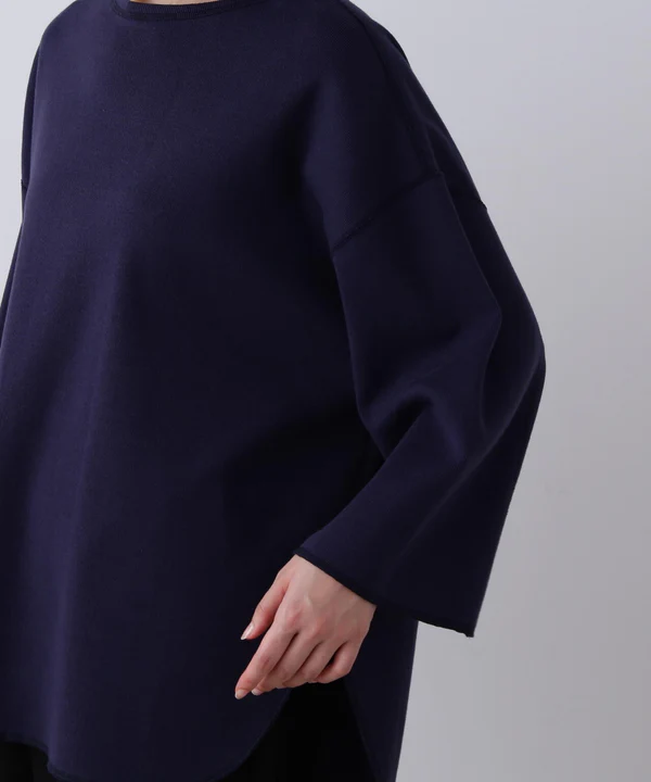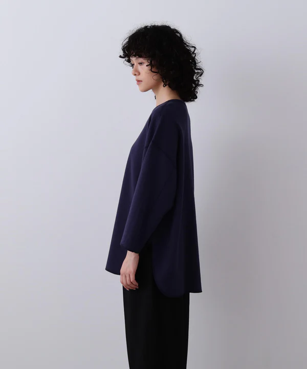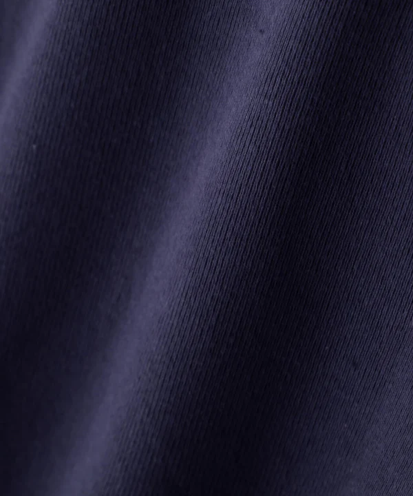 パターン設計からこだわり、立体的なシルエットが特徴。全てフラットシーマー縫製で仕立てており、太めのラフな糸を2PLYで編むことで、しっかりとした肉感と適度なテンションのあるフライス素材に仕上げました。