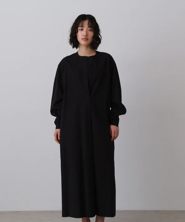 特殊な加工によって綿本来の質感を残しつつ、張り感のあるヴィンテージのようななれた風合いの素材です。ダーツとステッチワークの構築をナローシルエットで抑えたワンピース。