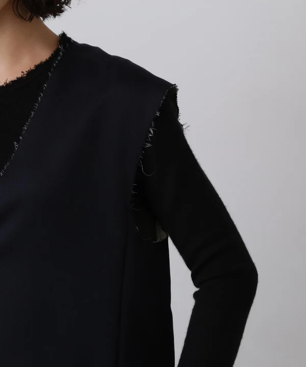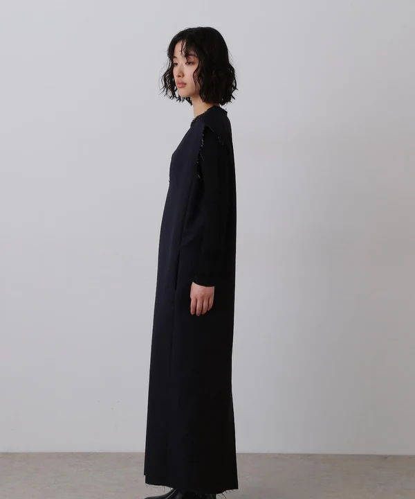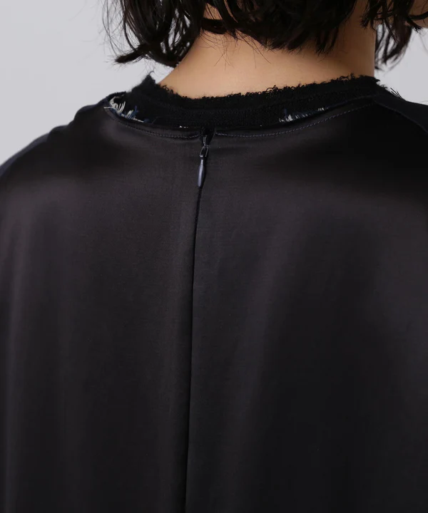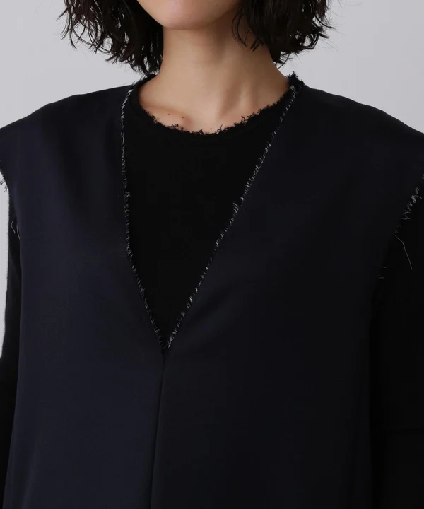 緯糸モヘア50%原料の糸を使用したモヘアならではの光沢感と自然なハリコシのあるギャバとヴィスコースの濡れたような艶のサテンとの組み合わせです。断ち切り始末のVネックドレスです。